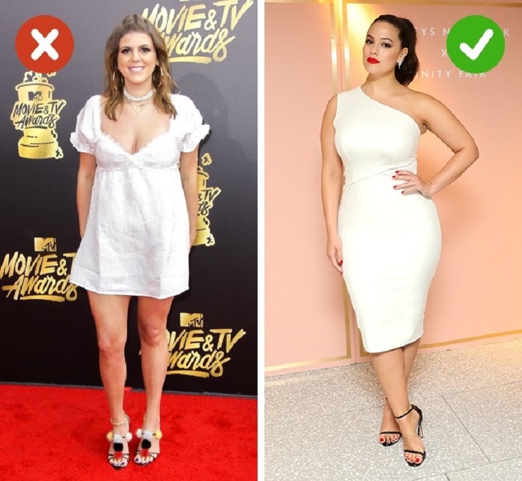 Curvy women had better choose knee-length or slightly longer dresses where the waistline will be moved up or down. Dresses with a V-neck will help to emphasize the bust and visually lengthen the neck.
