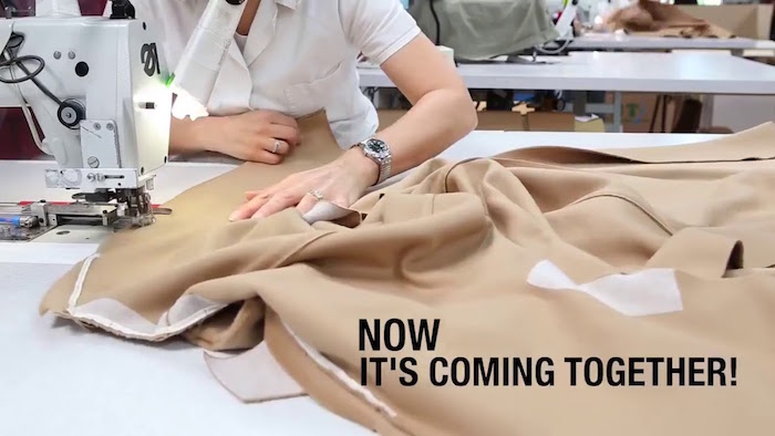 All material is cut by machine — blades for fabrics, laser for leathers — to precise measurements to minimise fabric waste; the company aims to use 84% of all cloth, and leftover material is collected by a specialist recycling firm. Cutting all the panels for one coat takes around a minute, after which they are measured and placed on trolleys to be transferred to the large sewing room.