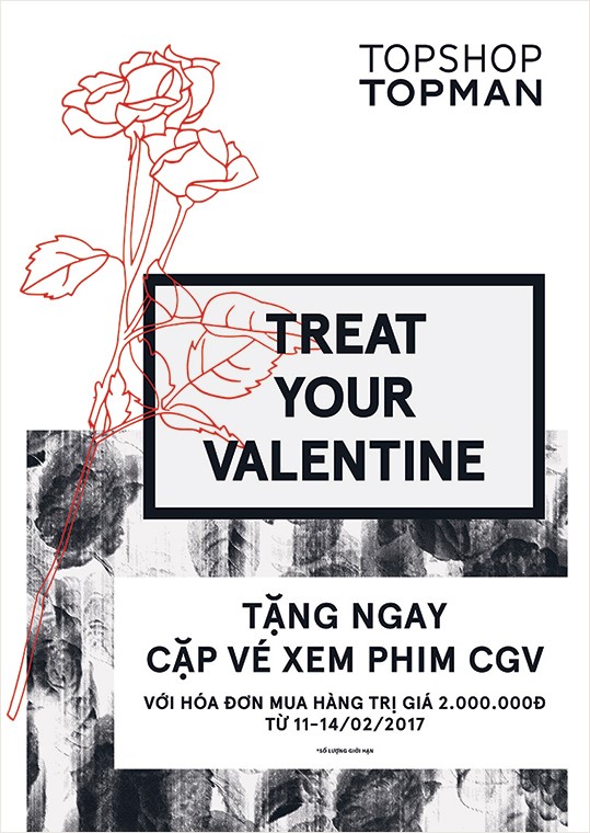 Even better, you can show off your new stylish pieces and enjoy a free Valentine movie with your date at any CGV cinemas. Promotion applied for bill from 2 mil. vnd, from 11 – 14 February 2017, at any TOPSHOP TOPMAN stores nationwide. Come quick folks, tickets are limited!