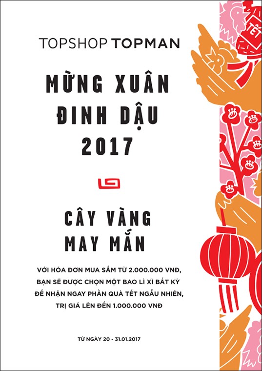 Let’s prepare a cozy and well-cared Lunar New Year 2017 by shopping new clothes for you and your beloved ones. Especially, customers with any invoices from 2,000,000vnd will be rewarded a chance to collect a red envelope from the Lucky Tree, worth up to 1,000,000vnd. Besides, lucky customers will also receive a beautiful Lunar New Year card design written in traditional calligraphy style. Happy Lunar New Year 2017 promotion applied from 20 – 31 January 2017 at all Topshop Topman stores nationwide.