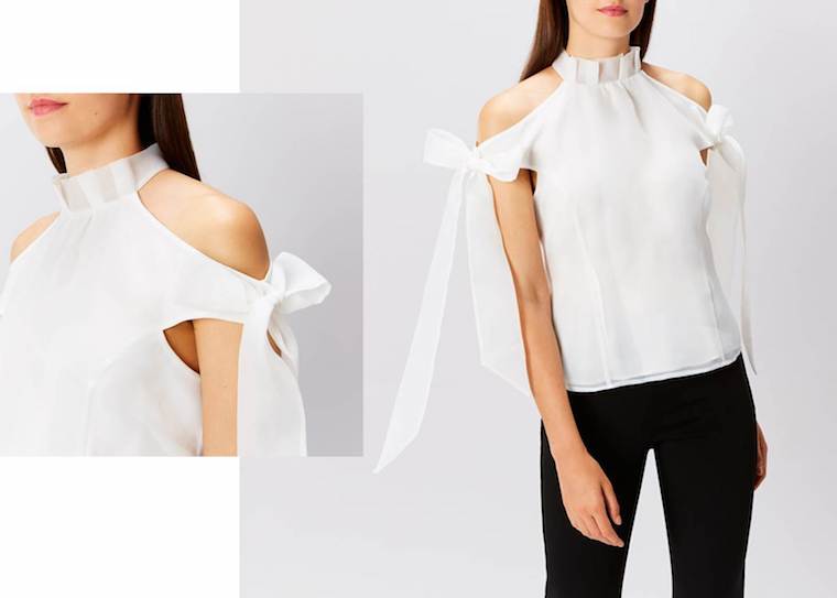 Một phong cách nữ tính tràn đầy với mẫu áo kết hợp nhiều chi tiết nhấn nhá. Cổ áo nhún nhẹ, hở vai và thắt nơ bản to, tất cả hòa hợp với nhau một cách nhẹ nhàng trên tông màu trắng thanh khiết.