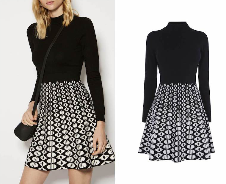 Là một cải tiến mới trong cách phối màu trắng-đen kinh điển, mẫu đầm len với phần chân váy in họa tiết hình học có phom dáng chữ A dễ dàng mặc trong bất kỳ hoàn cảnh nào, từ chốn công sở đến những buổi hẹn hò, dạo phố.