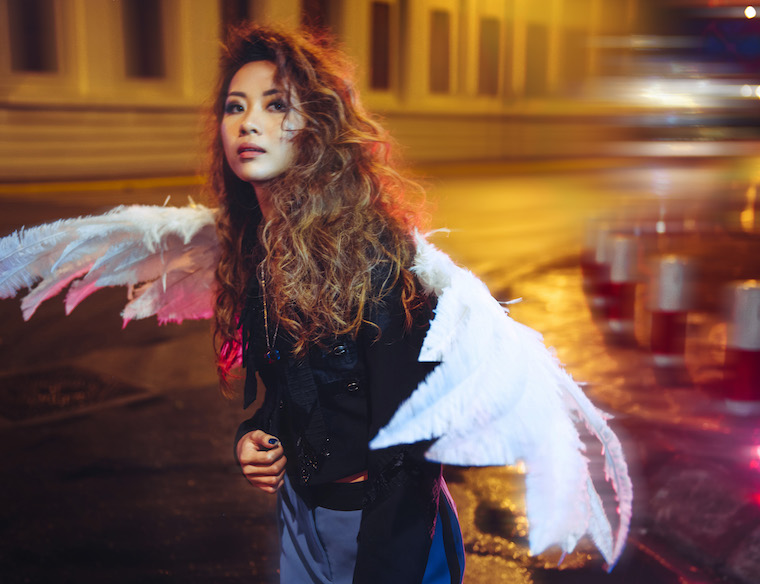 Giữa màn đêm ma mị, nàng rapper 9X hóa thiên thần cánh trắng trong bộ phối cá tính và kiểu tóc ấn tượng.