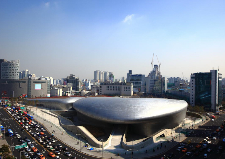 Toàn cảnh trung tâm thương mại Dongadaemum Design Plaza với lối kiến trúc tương lai.